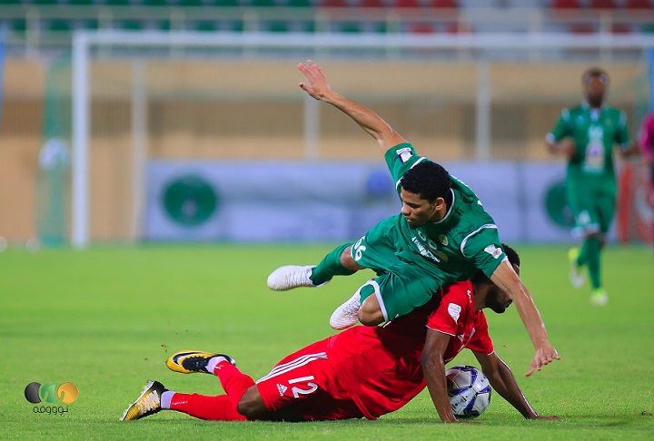 في الدقيقة 22 أضاع المهاجم ادمير انفرادا محققا عندما واجه الحارس نبيل المشايخي بعد كرة ساقطة خلف دفاعات نادي النهضة عن طريق حاتم الحمحمي إلا أن ادمير لم يستغل الفرصة الأخطر، بعد دقائق معدودة كانت ردة فعل نادي النهضة مماثلة، عندما كان محمد خصيب على مقربة من هز شباك مرمى محمد الذيب إلا أن كرته اصطدمت بالعارضة لتستمر النتيجة بالتعادل السلبي في الشوط الأول من المباراة الذي لم تشهد الدقائق العشر الأخيرة منه أي أحداث تذكر.