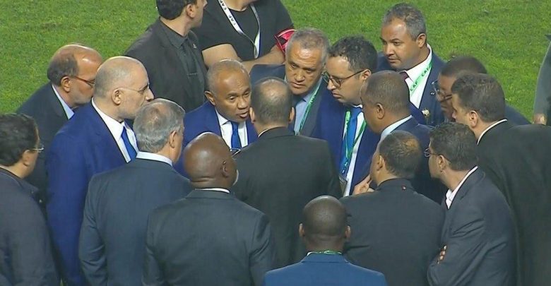 وحرص أحمد أحمد رئيس الاتحاد الأفريقي للعبة (كاف) ومسؤولي اللعبة في البلدين والناديين على النزول إلى أرضية الملعب في محاولة لحل الأزمة وسط احتجاجات كبيرة من التونسي فوزي البنزرتي المدير الفني للوداد.