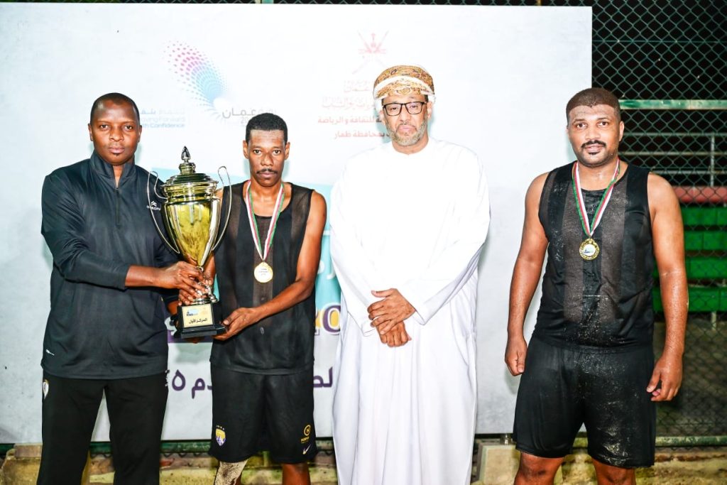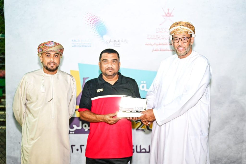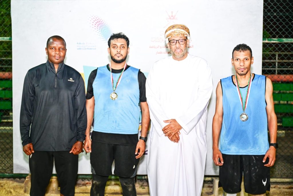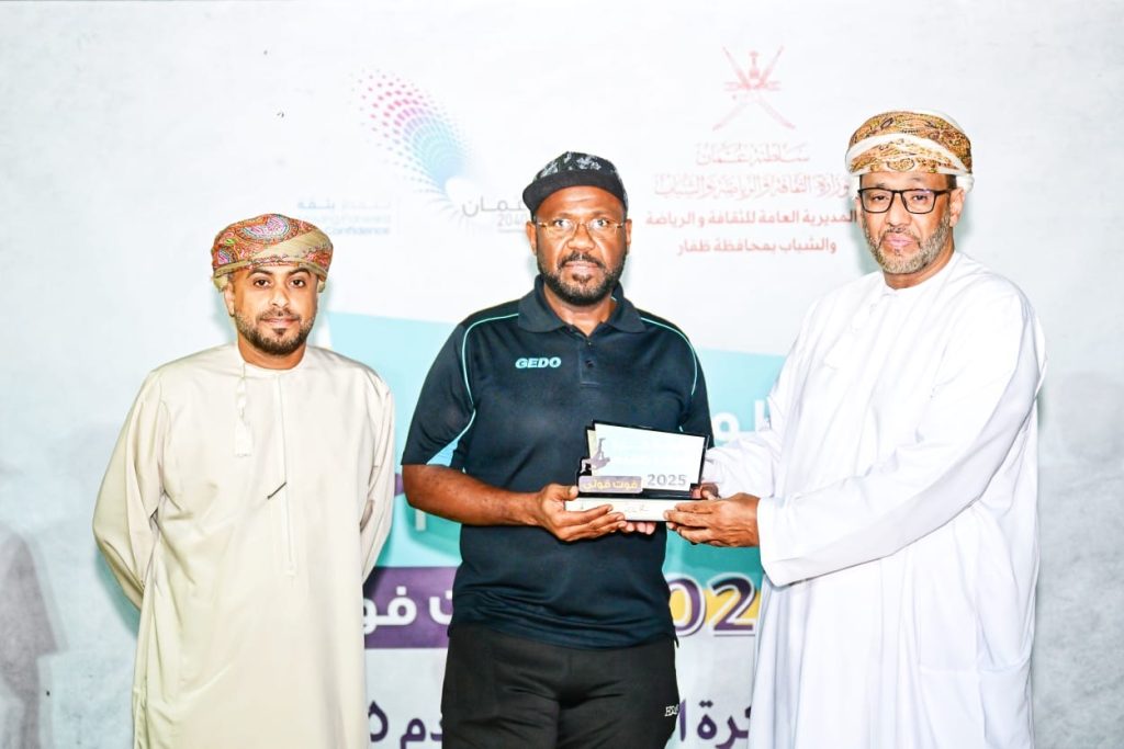 وفي الختام، قام فيصل بن علي النهدي، المدير العام المساعد للمديرية العامة للثقافة والرياضة والشباب بمحافظة ظفار والراعيُ لختام الحدث، بتتويج الفرق الحاصلة على المراكز الأولى واللجنة المشرفة على البطولة.